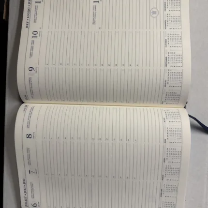 Uurindeling van 8.00-21.00 uur. Hoekperforatie. Leeslint. Crèmekleurig 70gr papier. Tweekleurendruk. Zestalig. 14-maands calendarium. Jaarkalender op elke pagina. Extra ruimte voor