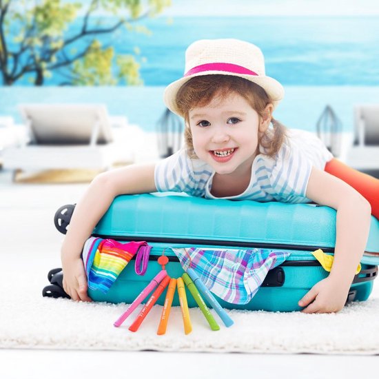 Maakt een einde aan verloren doppen. Met handige ring om alle stiften aan te schuiven. Ideaal voor onderweg, in de auto of het vliegtuig. Kan 24 uur zonder dop zonder uit te drogen! De tube vorm is niet alleen leuk om te zien maar werkt ook nuttig als rol-stop. Uitwasbare inkt. Etui met 12 kleuren en twee cap-ringen.