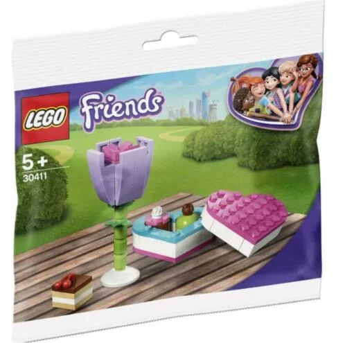 Een klein zakje van LEGO Friends (#30411) met daarin een bloem en een snoepdoos met 3 taartjes.