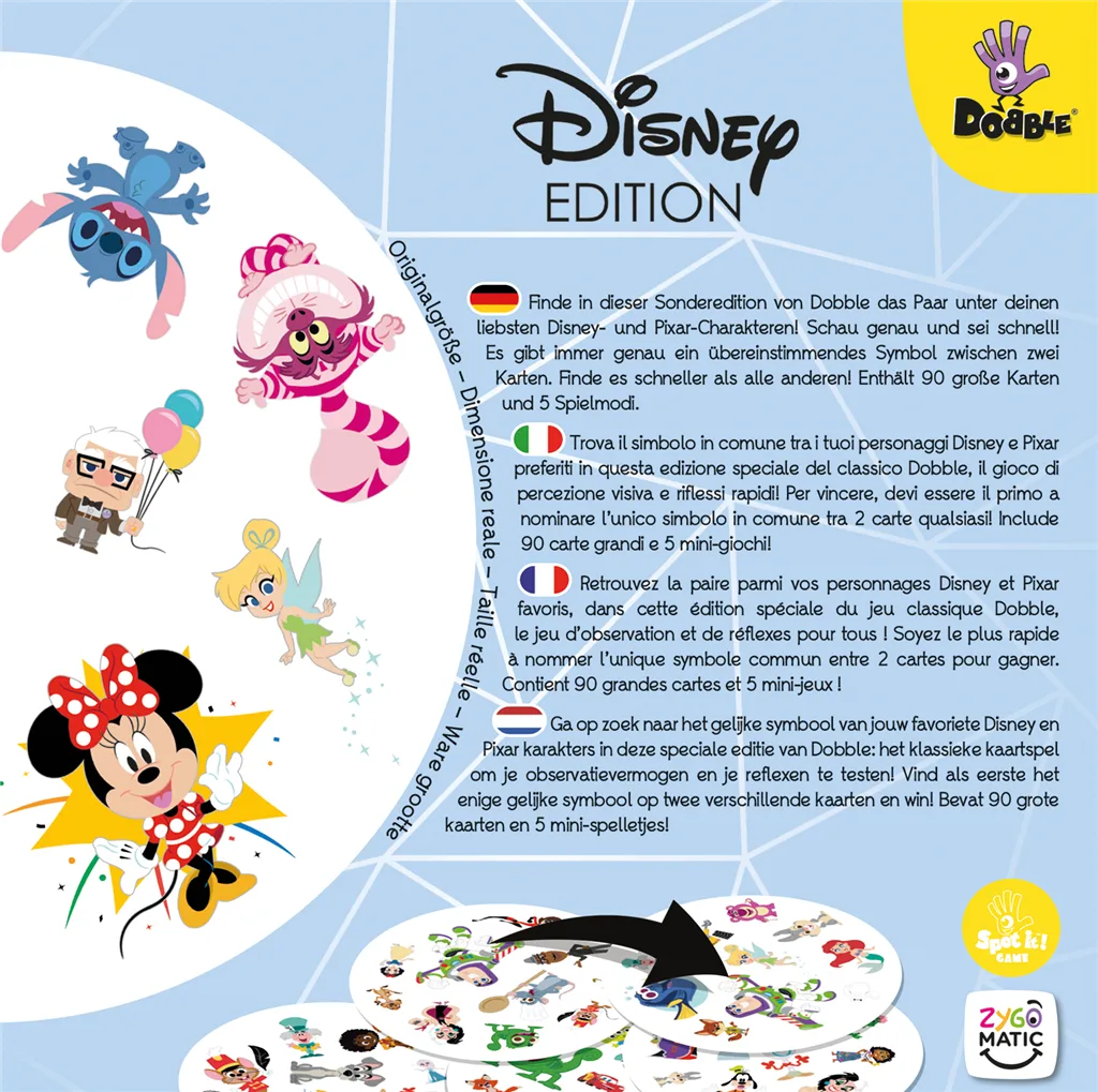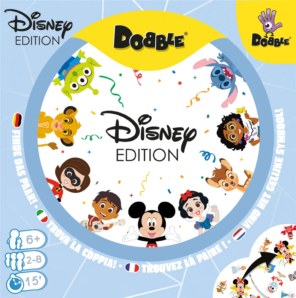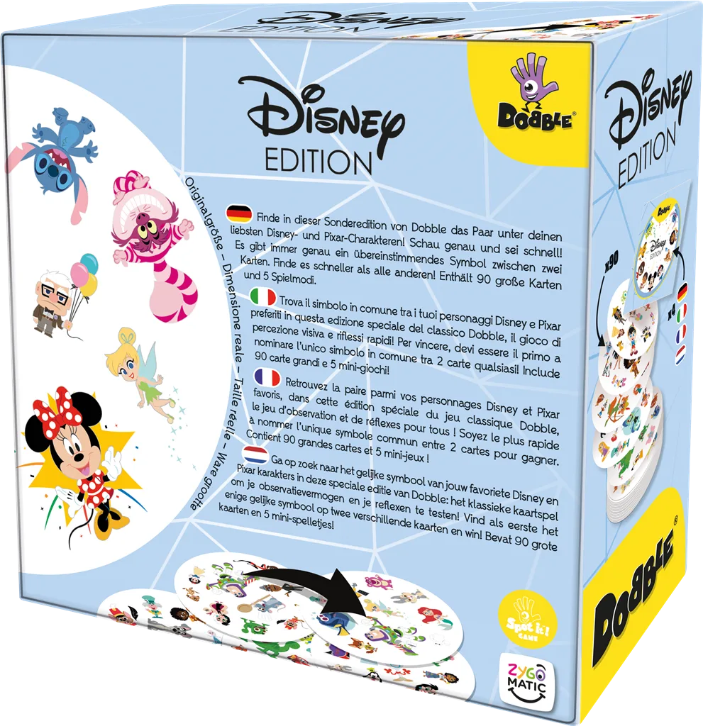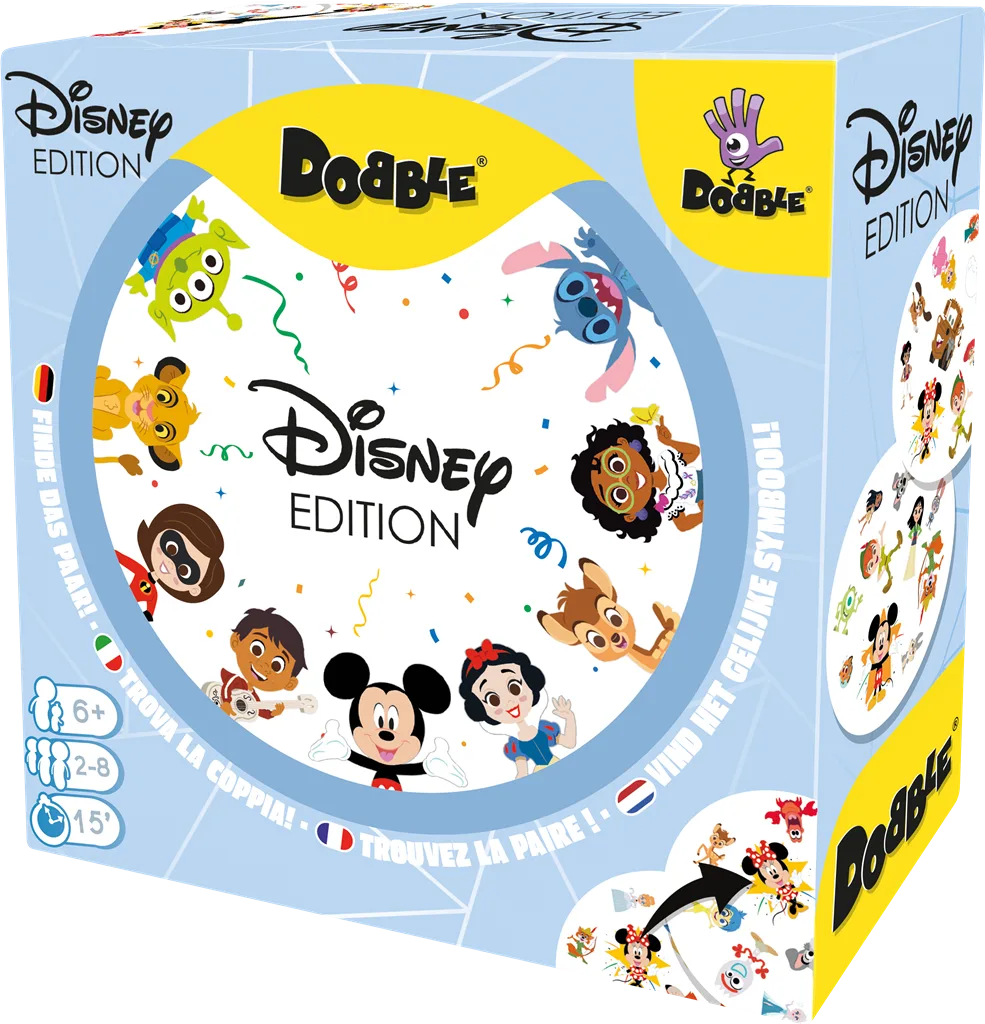 Ga op zoek naar het gelijke symbool van jouw favoriete Disney en Pixar karakters in deze speciale Disney editie van Dobble: het klassieke kaartspel om je observatievermogen en je reflexen te testen.