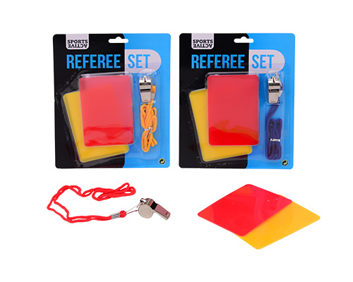 “Wil je de wedstrijd controleren als scheidsrechter? Met deze fluit en bijbehorende gele en rode kaarten ben jij een echte scheidsrechter. Zie je iets dat niet mag, blaas snel op je fluitje en haal je kaarten tevoorschijn!